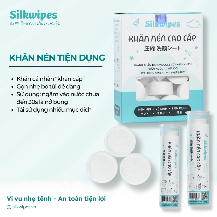 - Khăn nén Silkwipes an toàn với da do khăn được nén ở dạng khô và được đóng trong bao bì đạt tiêu chuẩn nên hoàn toàn an toàn với làn da con người.